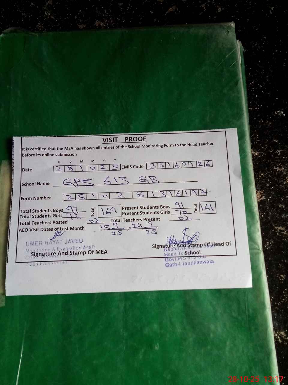 | Attendance Register | Head Teacher | MEA with School | Visit Proof |