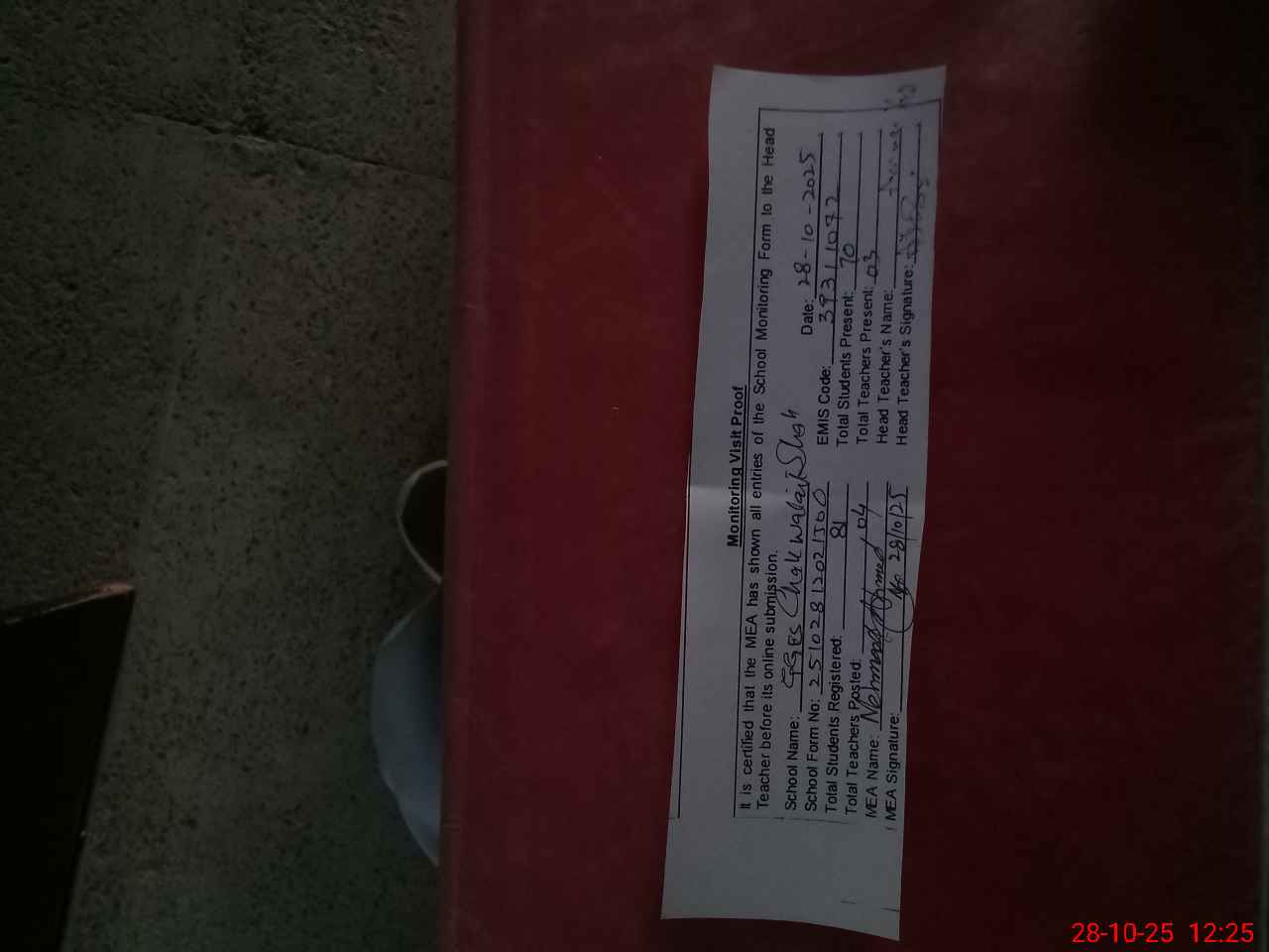 | Attendance Register | Head Teacher | MEA with School | Visit Proof |
