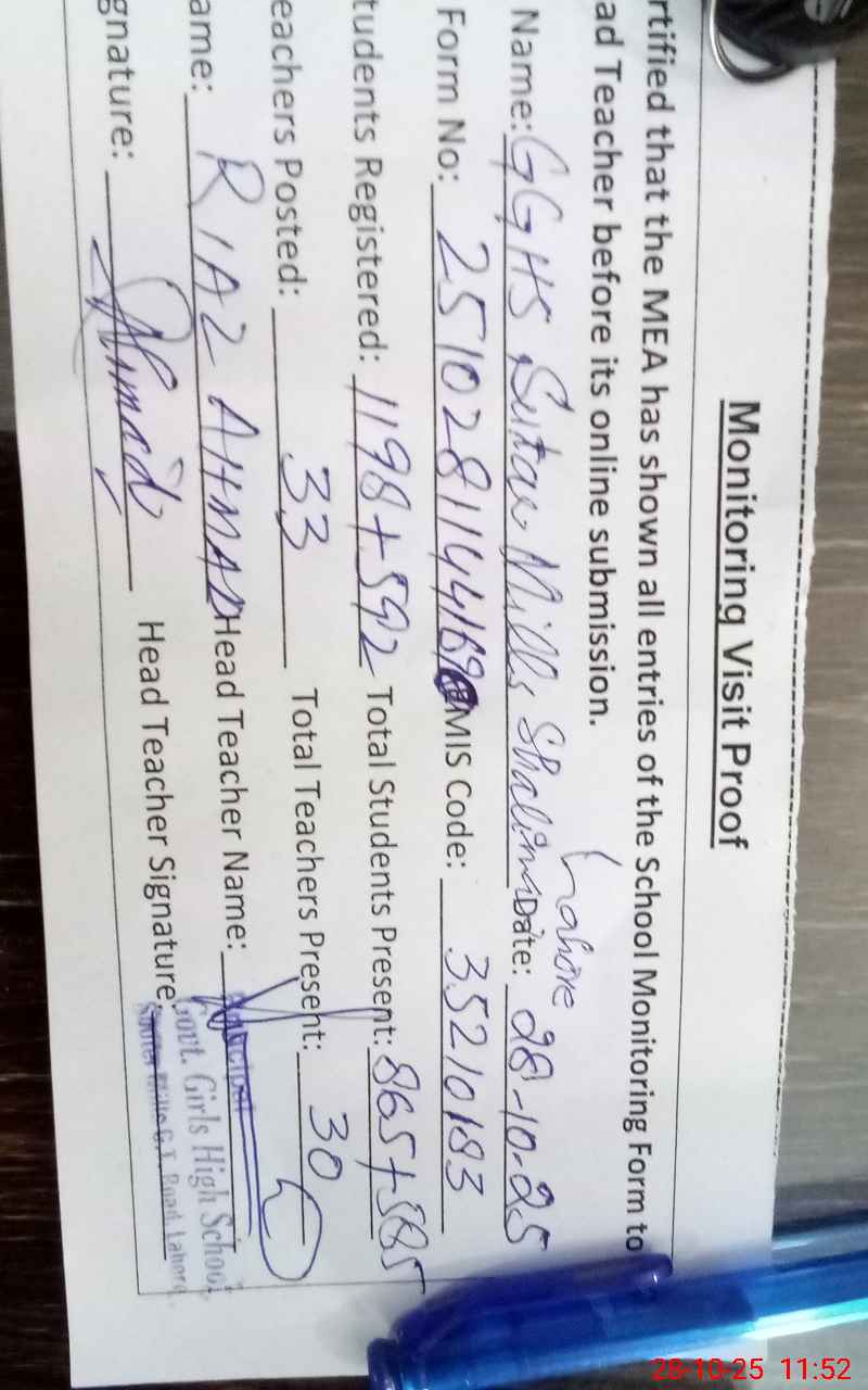 | EMIS Code: 35210183 | Name of School: GGHS SUTAR MILLS | |||