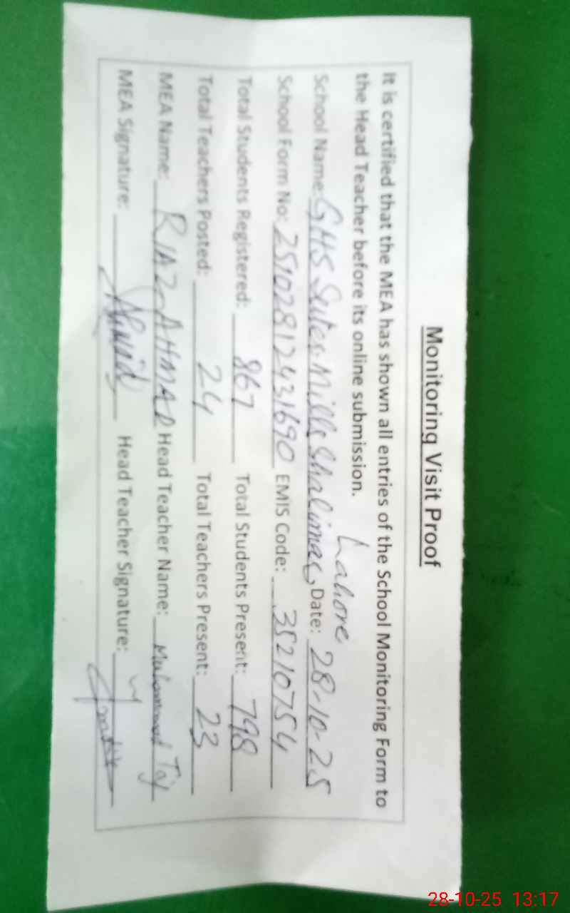 | EMIS Code: 35210754 | Name of School: GHS SUTAR MILLS TEHSIL SHALIMAR (Newly upgraded) | |||