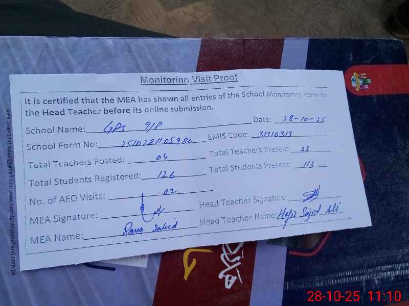 | EMIS Code: 31310313 | Name of School: GPS CHAK NO. 9/P | |||