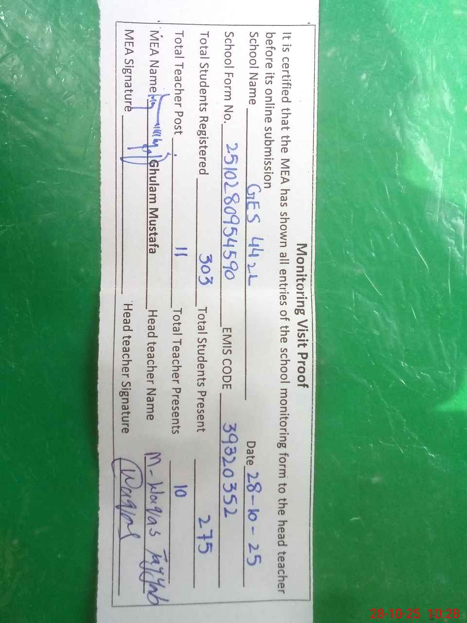 | Attendance Register | Head Teacher | MEA with School | Visit Proof |