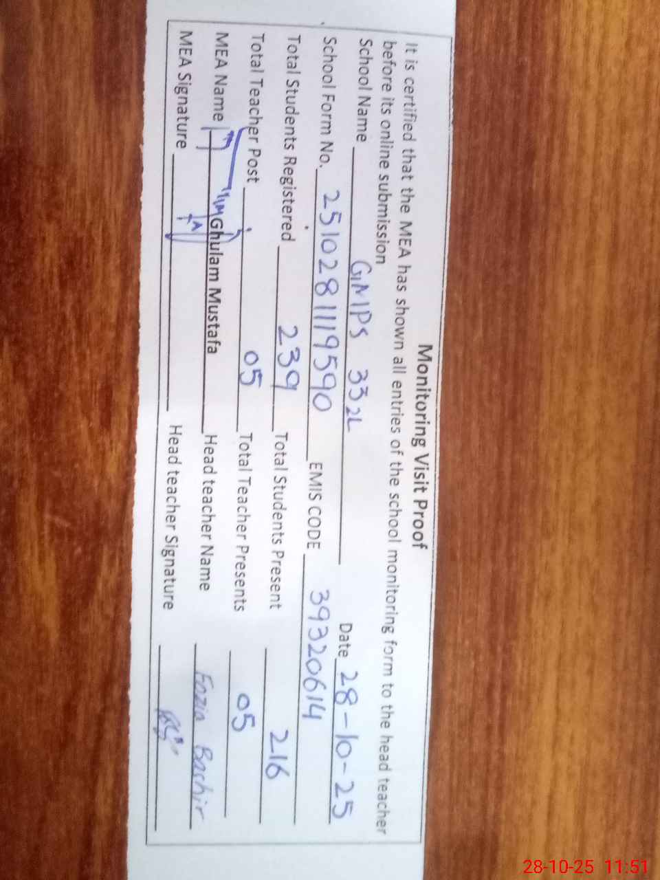 | Certified that this School was Inspected by the Undersigned MEA/DMO Today and the Information Stated Above is as Per Record. | |||||