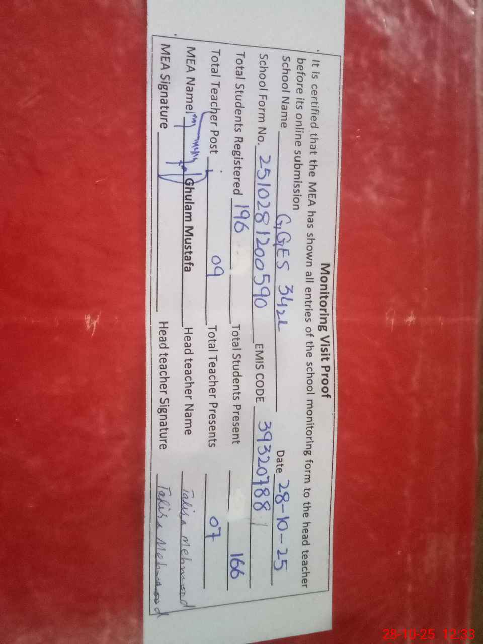 | Attendance Register | Head Teacher | MEA with School | Visit Proof |