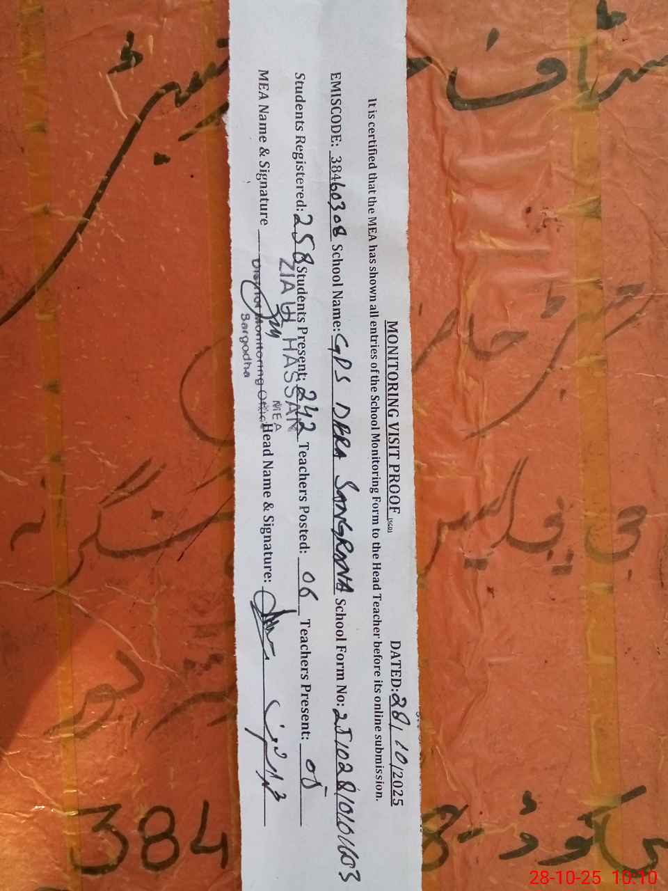| Certified that this School was Inspected by the Undersigned MEA/DMO Today and the Information Stated Above is as Per Record. | |||||