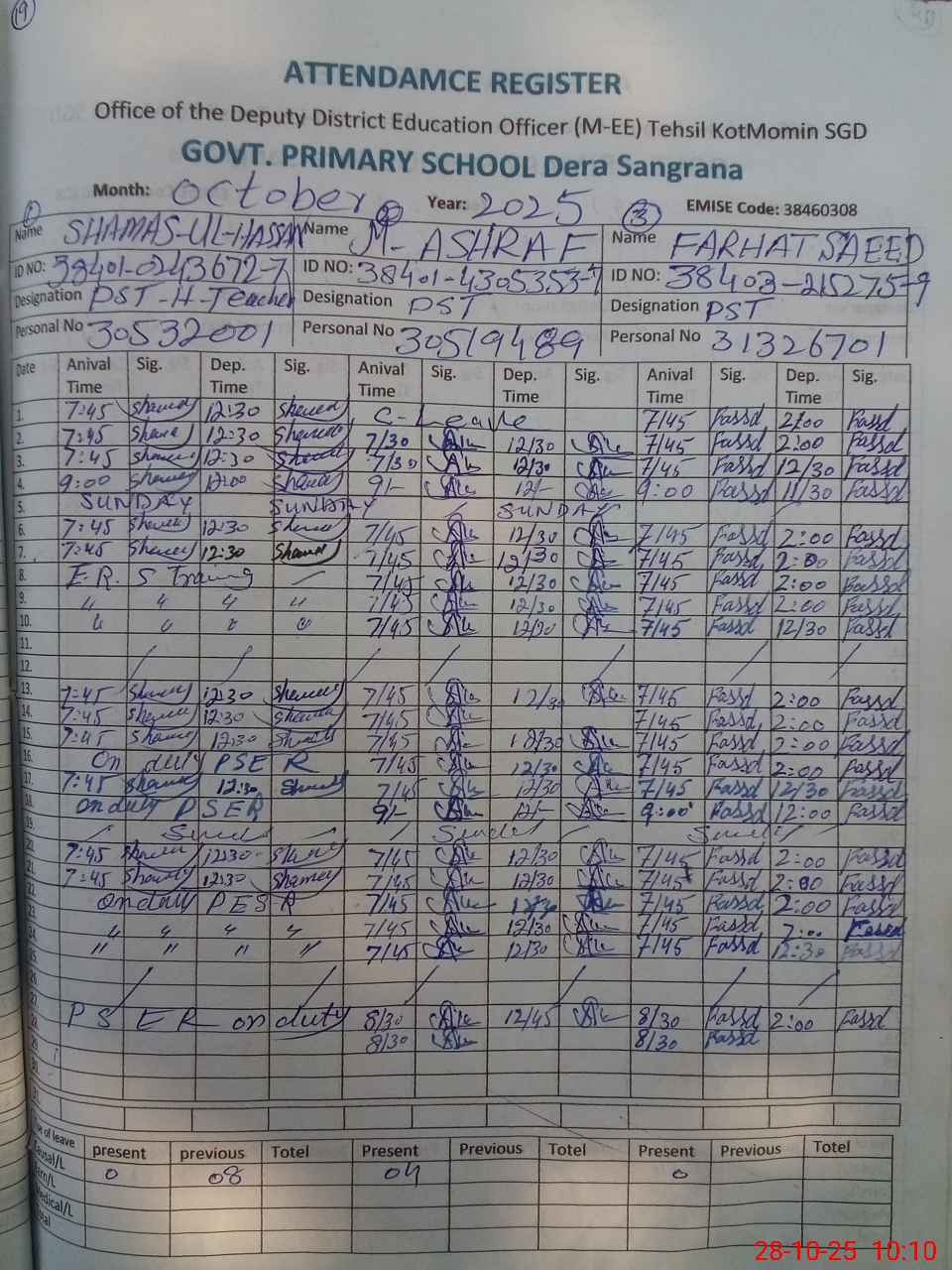 | CNIC | Full Name | Designation | R/C | Absence during last cal. month |