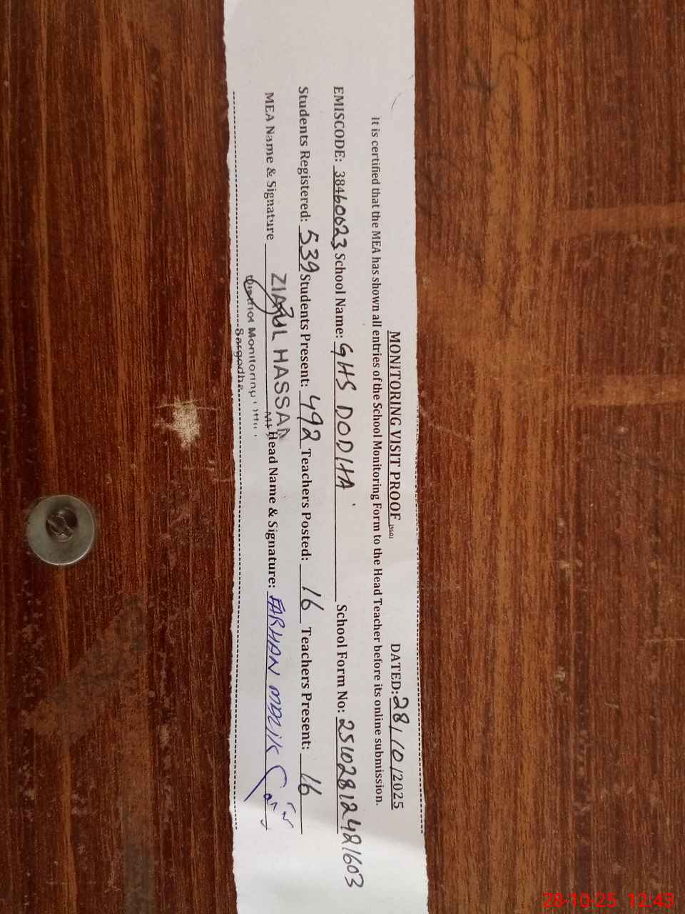 | Certified that this School was Inspected by the Undersigned MEA/DMO Today and the Information Stated Above is as Per Record. | |||||