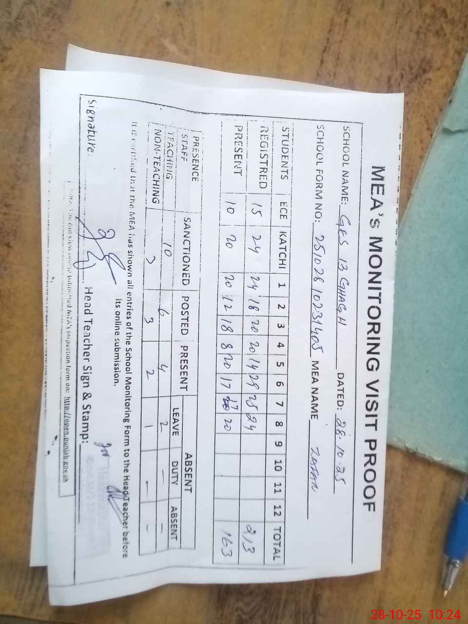 | Attendance Register | Head Teacher | MEA with School | Visit Proof |