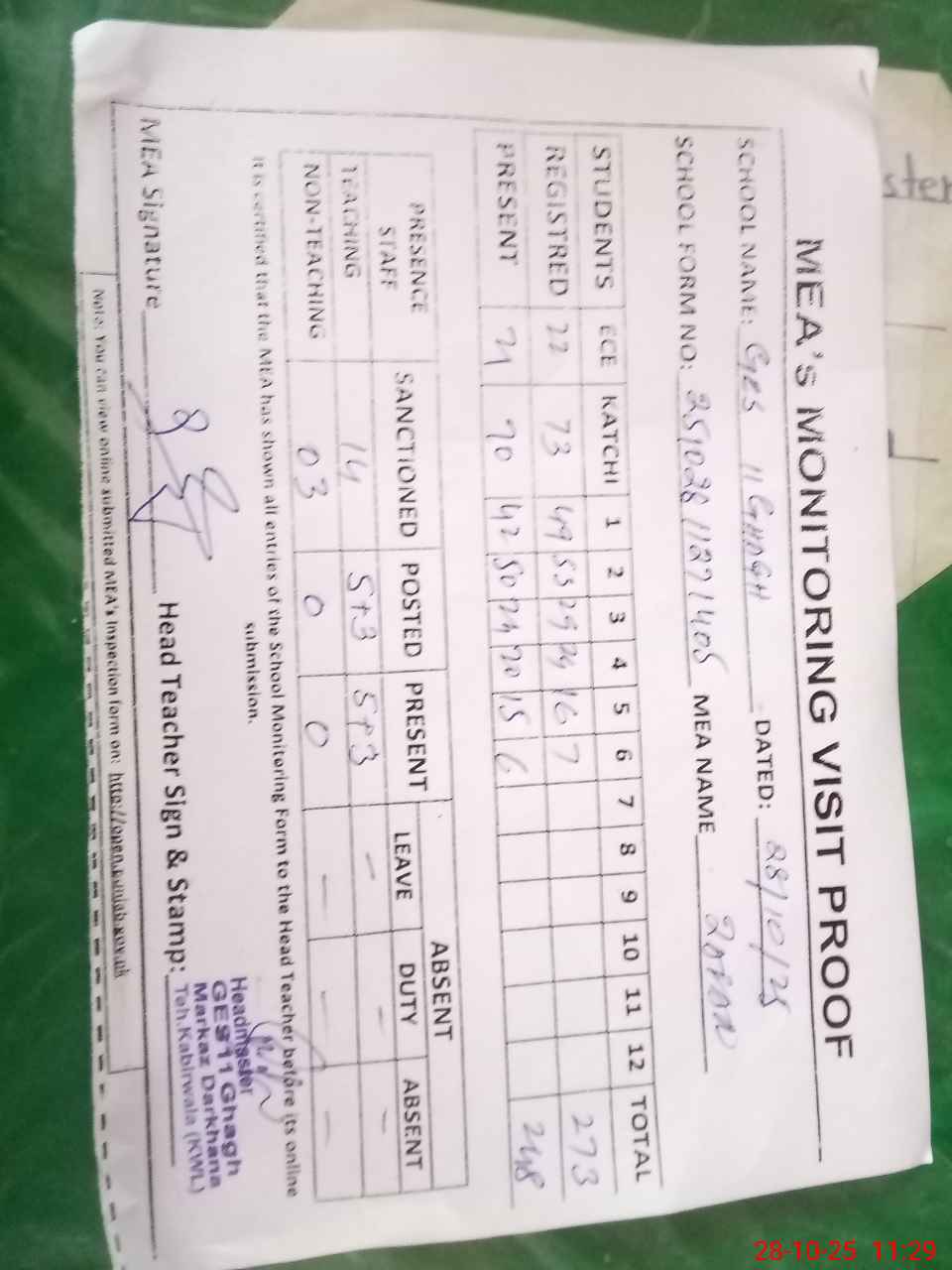 | Attendance Register | Head Teacher | MEA with School | Visit Proof |