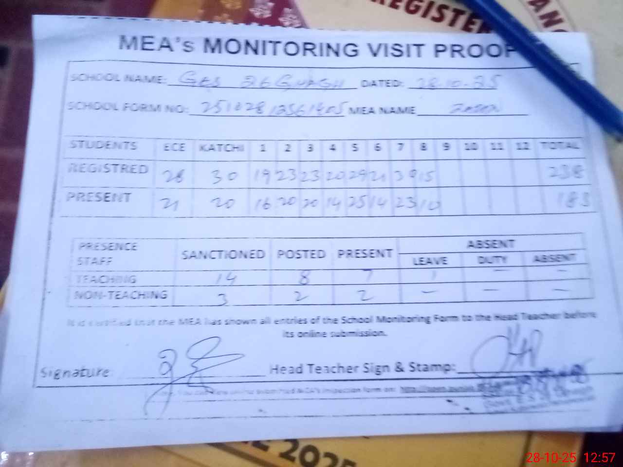 | Attendance Register | Head Teacher | MEA with School | Visit Proof |