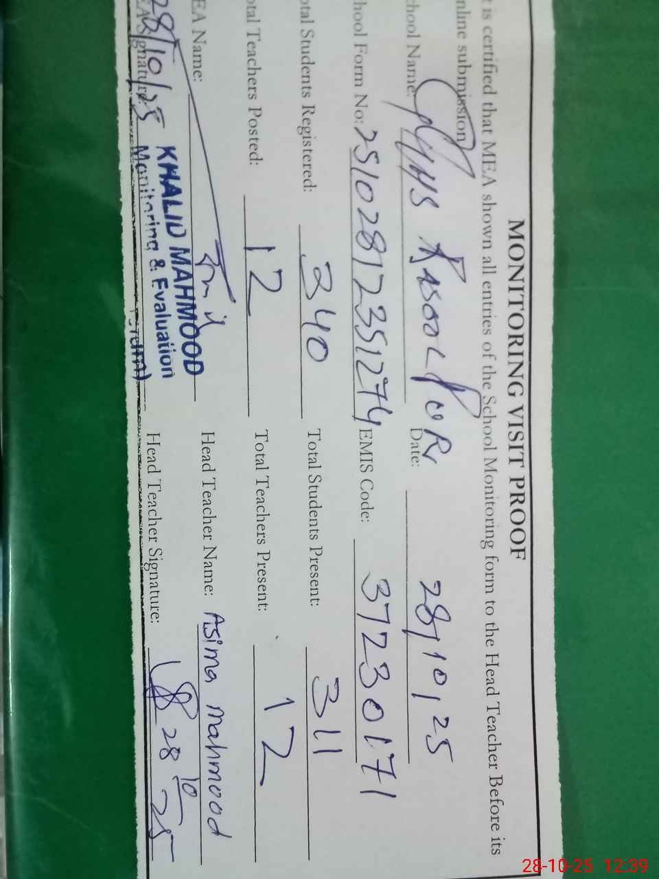 | Attendance Register | Head Teacher | MEA with School | Visit Proof |