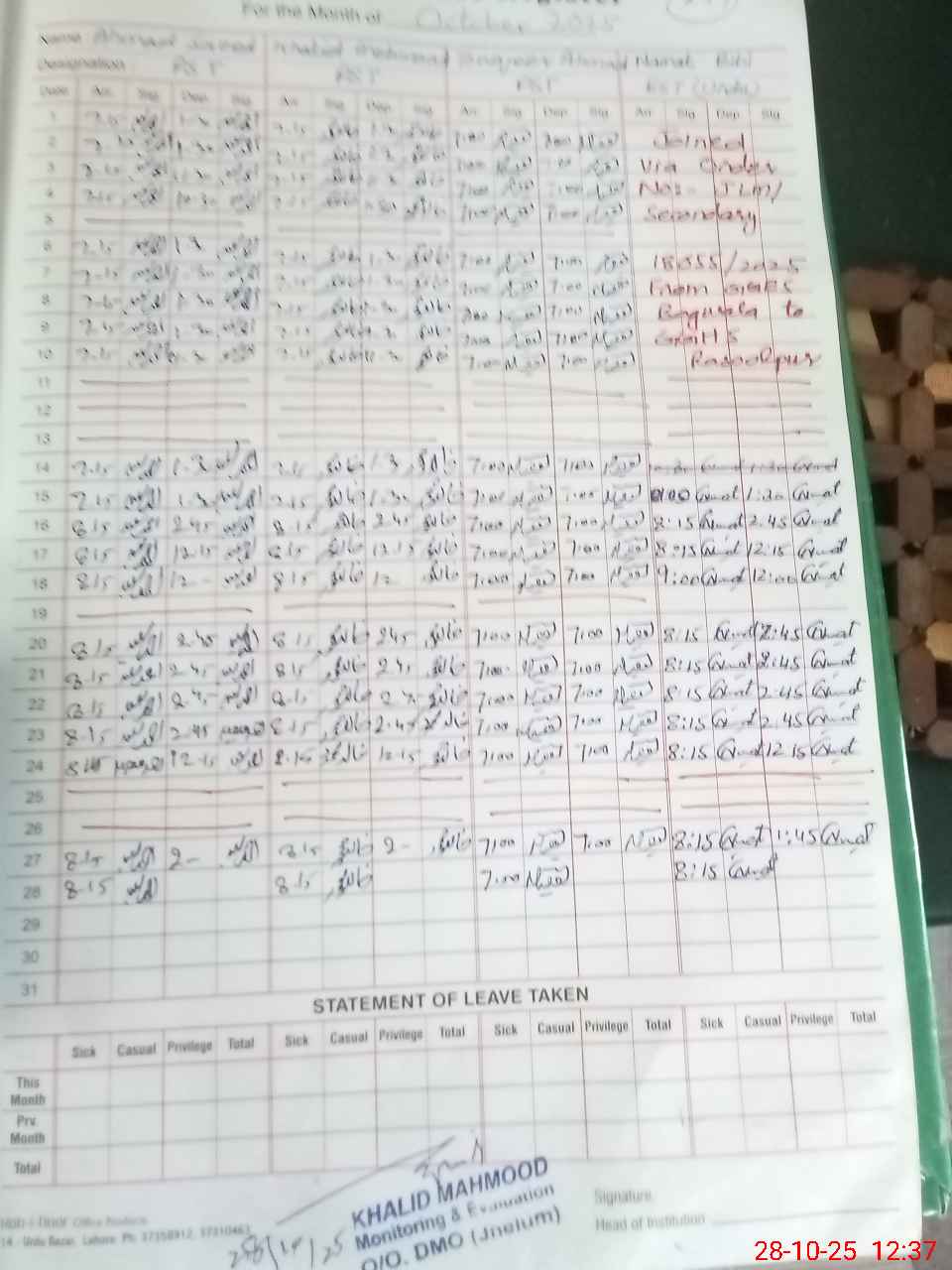 | CNIC | Full Name | Designation | R/C | Absence During Last Calender Month |
