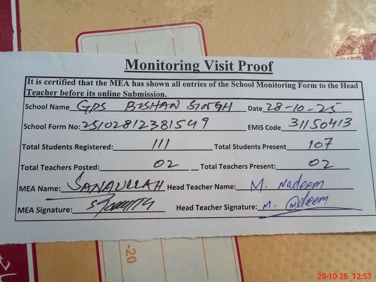 | Attendance Register | Head Teacher | MEA with School | Visit Proof |