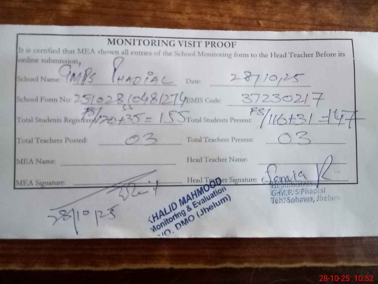 | Certified that this School was Inspected by the Undersigned MEA/DMO Today and the Information Stated Above is as Per Record. | |||||