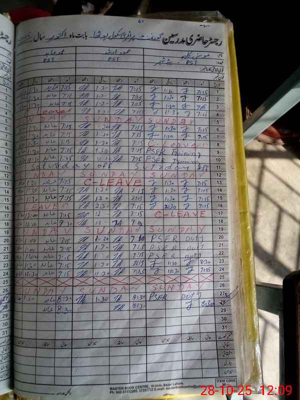 | CNIC | Full Name | Designation | R/C | Absence During Last Calender Month |