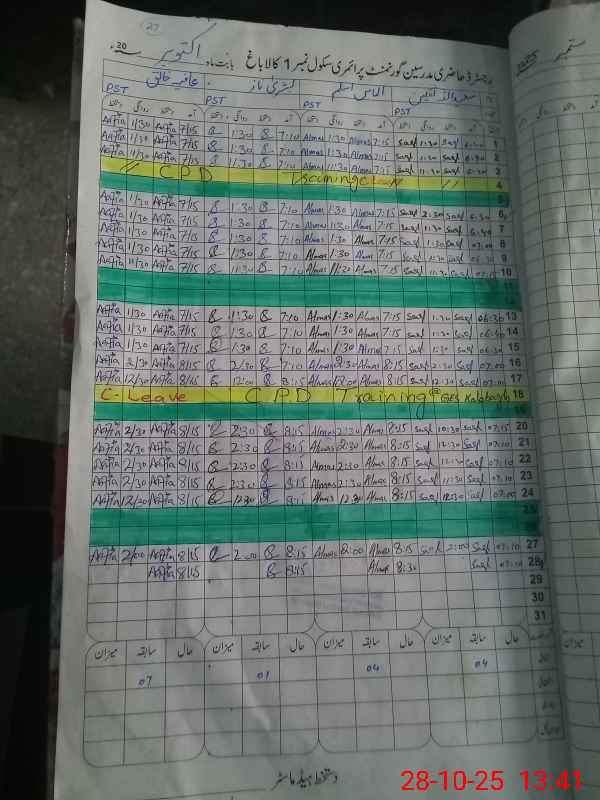 | Total no. of Classrooms: 6 No. of Classrooms Used for Teaching: 6 No. of Classrooms Storing Old Furniture, FTBs, etc: 0Comments if Any: PST Sehrish Mubern was unauthorized since 10 September 2024 to15 august 2025 and again un authorized since 13 September 2025 Till now no leave record was available and not shown to MEA during the visit |