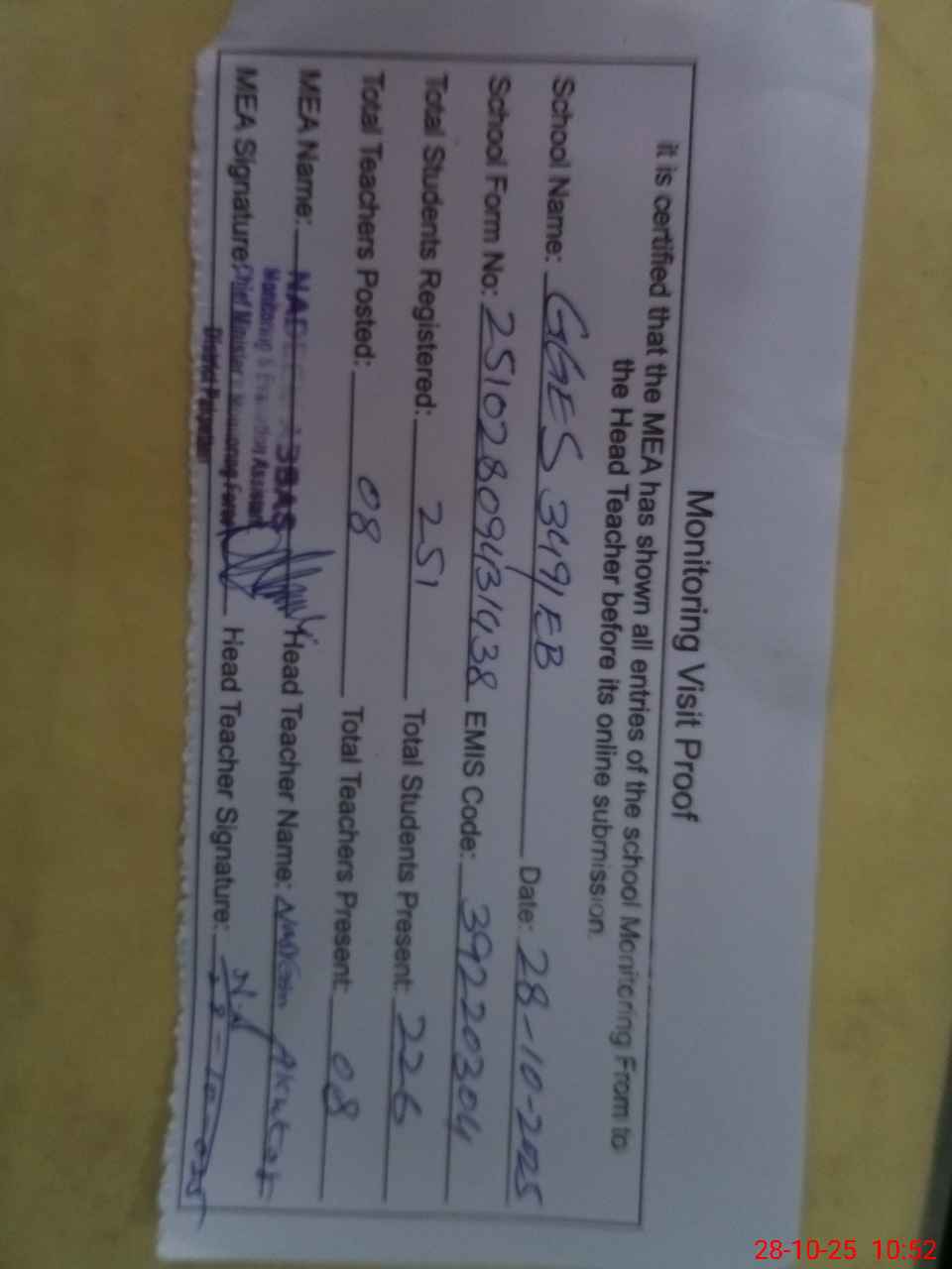 | Certified that this School was Inspected by the Undersigned MEA/DMO Today and the Information Stated Above is as Per Record. | |||||