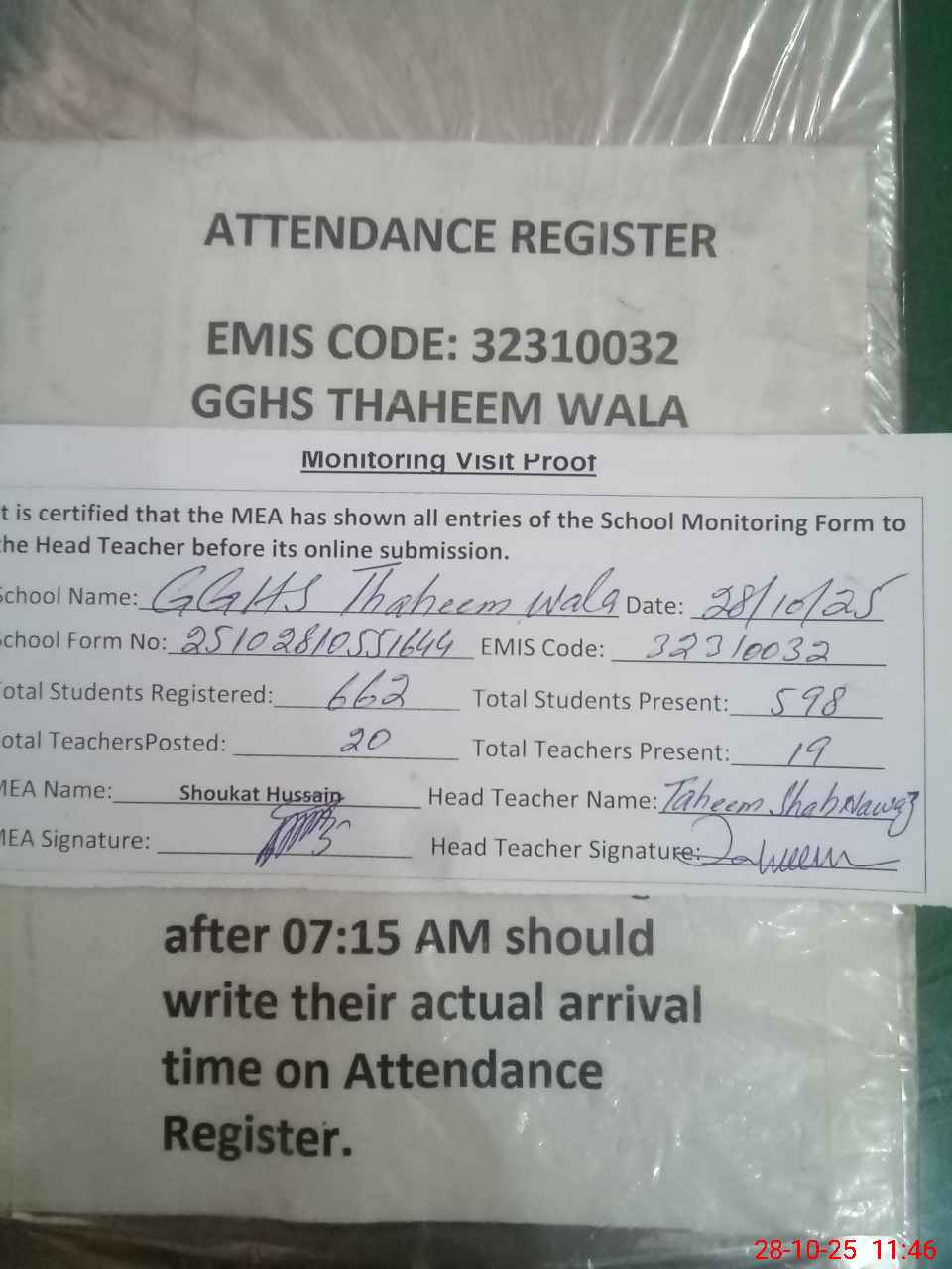 | Attendance Register | Head Teacher | MEA with School | Visit Proof |