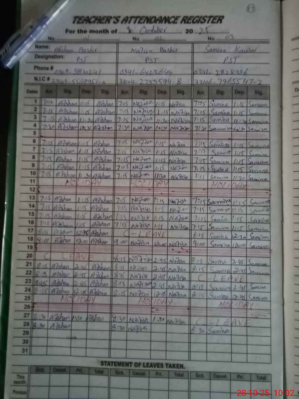 | CNIC | Full Name | Designation | R/C | Absence During Last Calender Month |