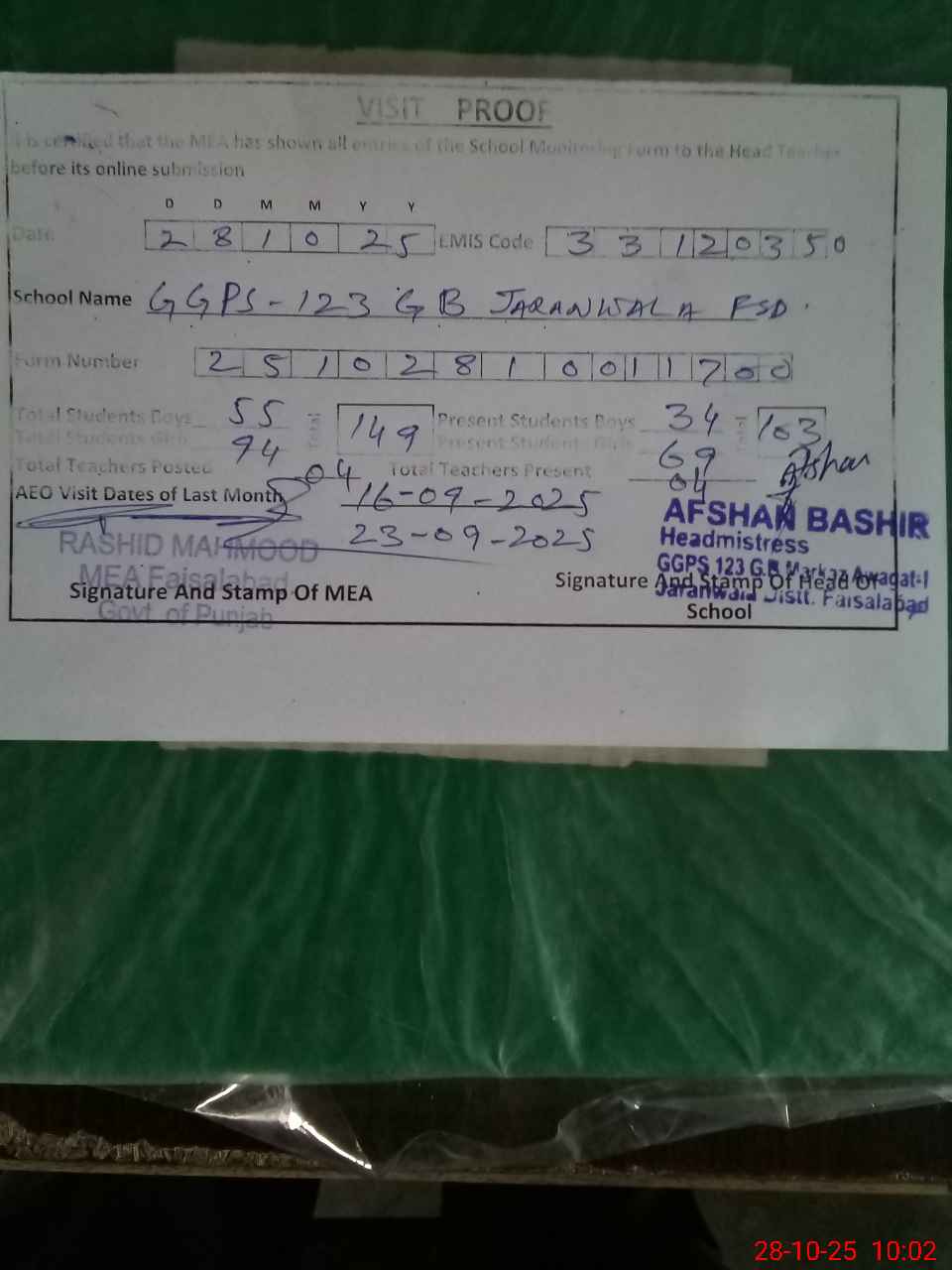 | Attendance Register | Head Teacher | MEA with School | Visit Proof |