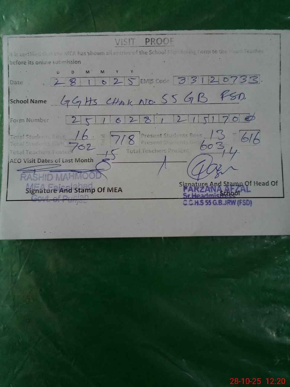 | EMIS Code: 33120733 | Name of School: GGHS CHAK 55 GB | |||