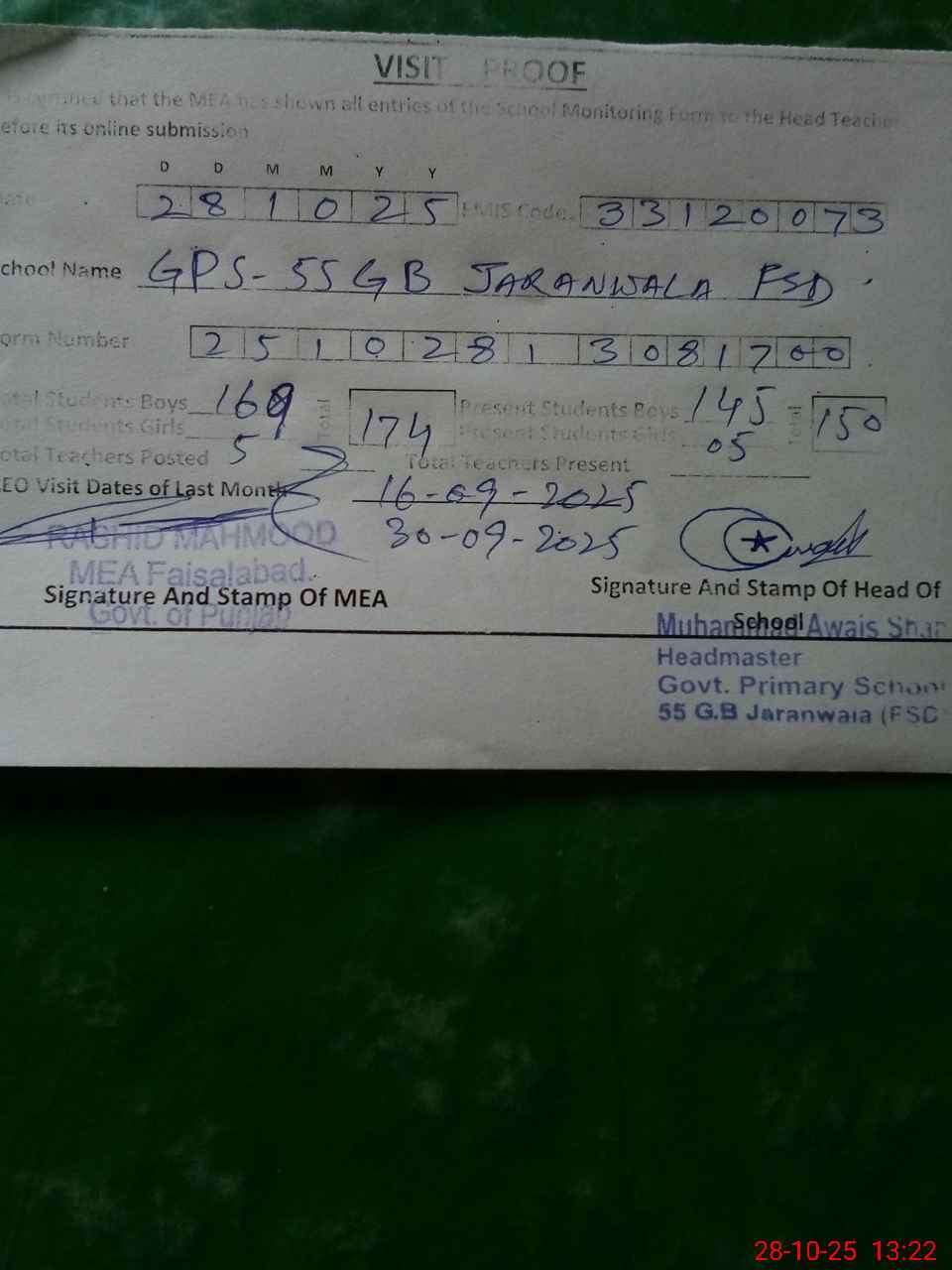 | EMIS Code: 33120073 | Name of School: GPS CHAK 55 GB JARANWALA FSD | |||