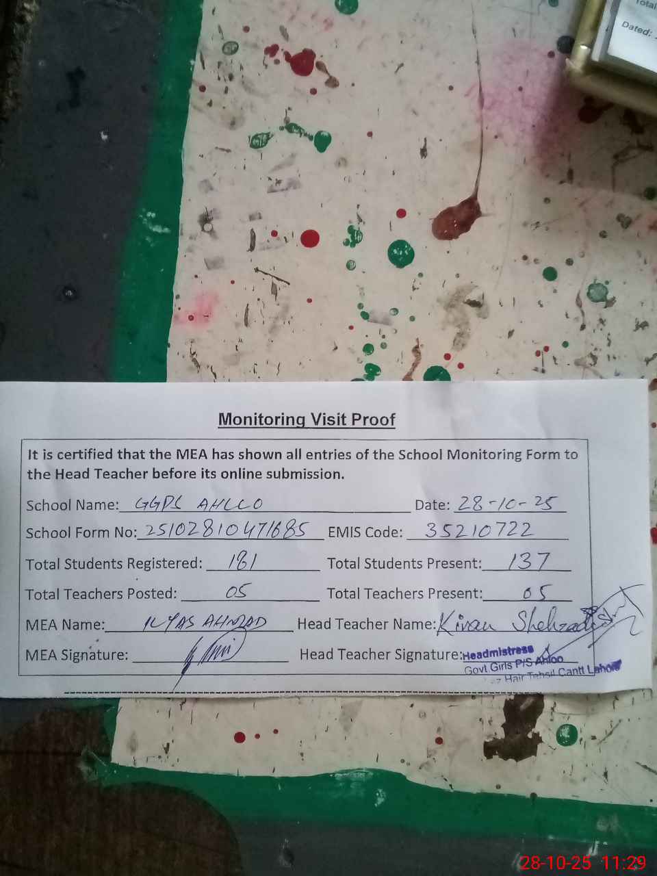 | Remarks (Use Separate Page if Required): School is facing shortage of class rooms only 02 room for about 181 strength ECE and Kachi classes are arranged in Corridor each room contain two classes and one class under the Shed Student attendance is about 76 percent today | |||||
