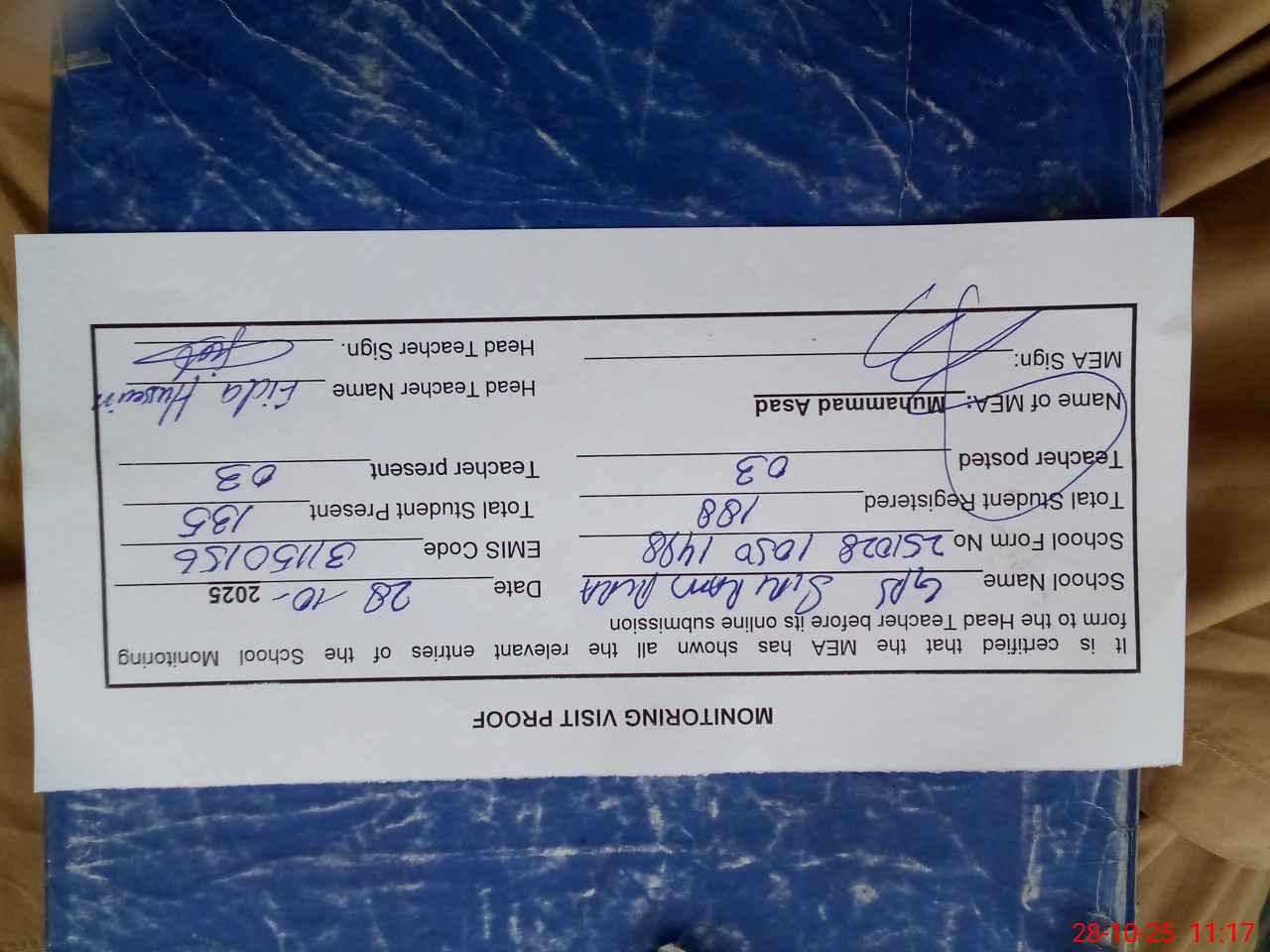 | Attendance Register | Head Teacher | MEA with School | Visit Proof |
