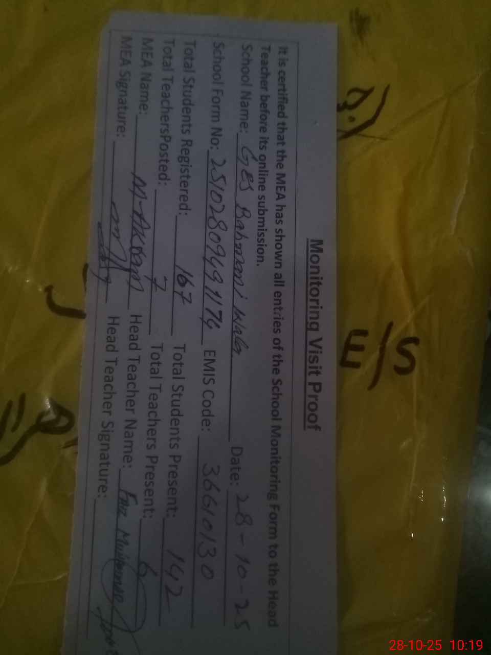 | Attendance Register | Head Teacher | MEA with School | Visit Proof |