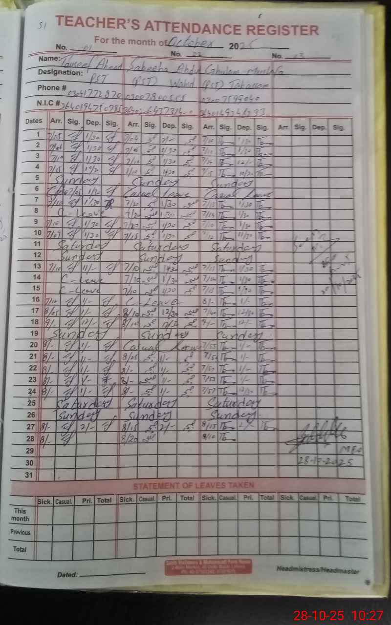 | Name: TA**** AH**** Designation: (School Headmaster's/Headmistress's) PST Phone/Cell Number: 03**** |