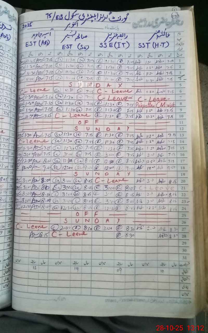 | CNIC | Full Name | Designation | R/C | Absence During Last Calender Month |