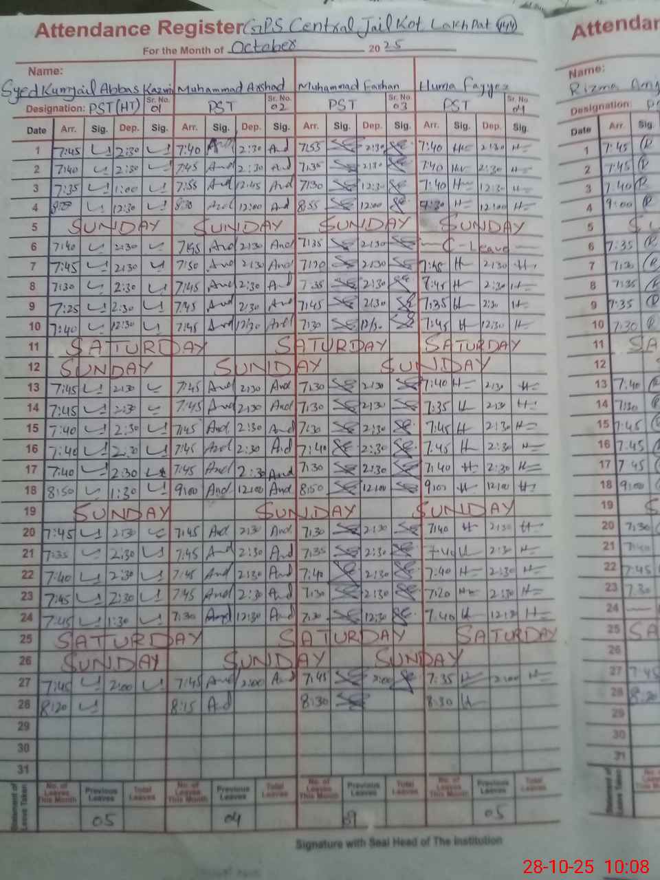 | CNIC | Full Name | Designation | R/C | Absence During Last Calender Month |
