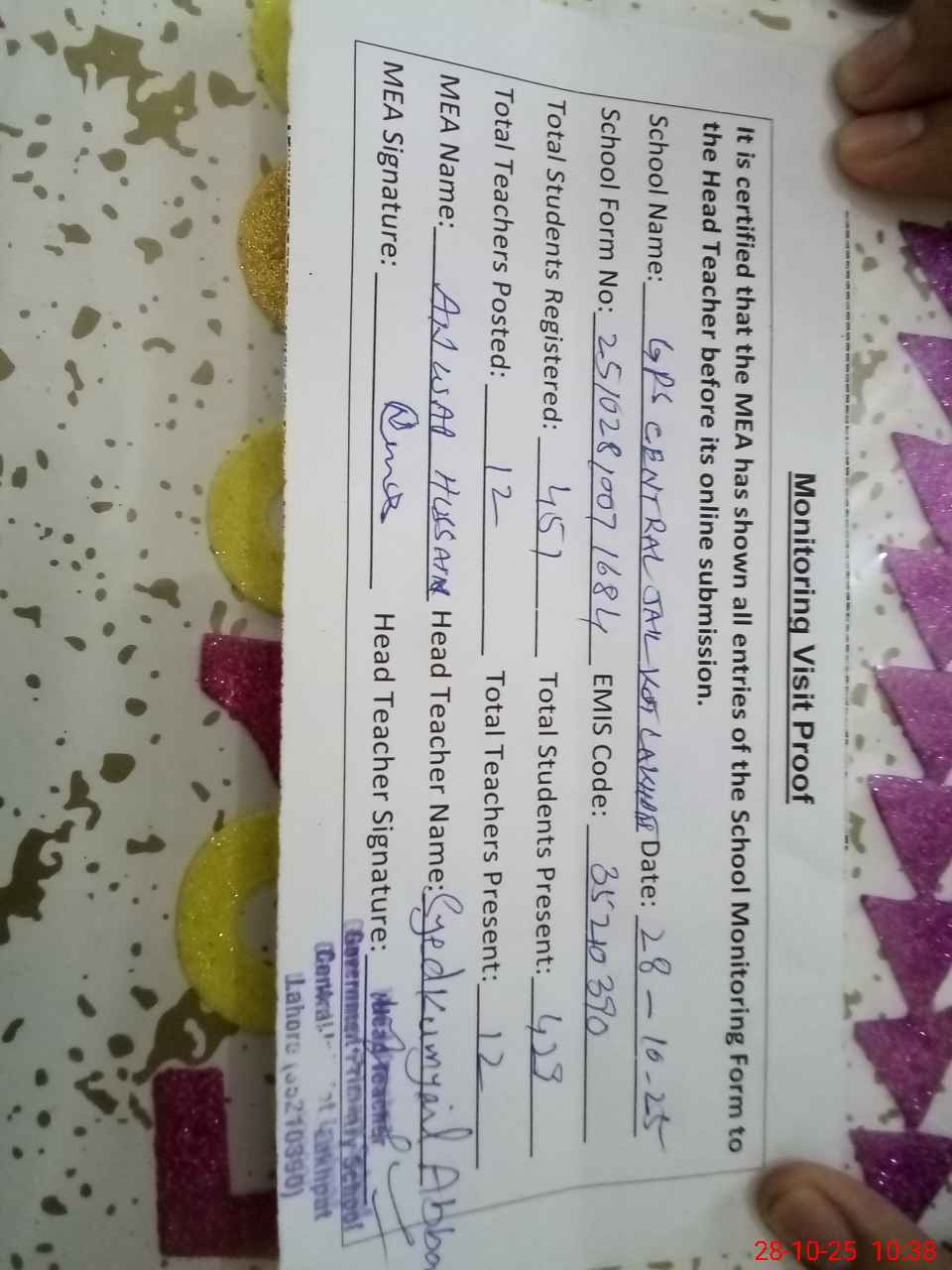 | EMIS Code: 35210390 | Name of School: GPS CENTRAL JAIL KOT LAKHPAT LHR | |||
