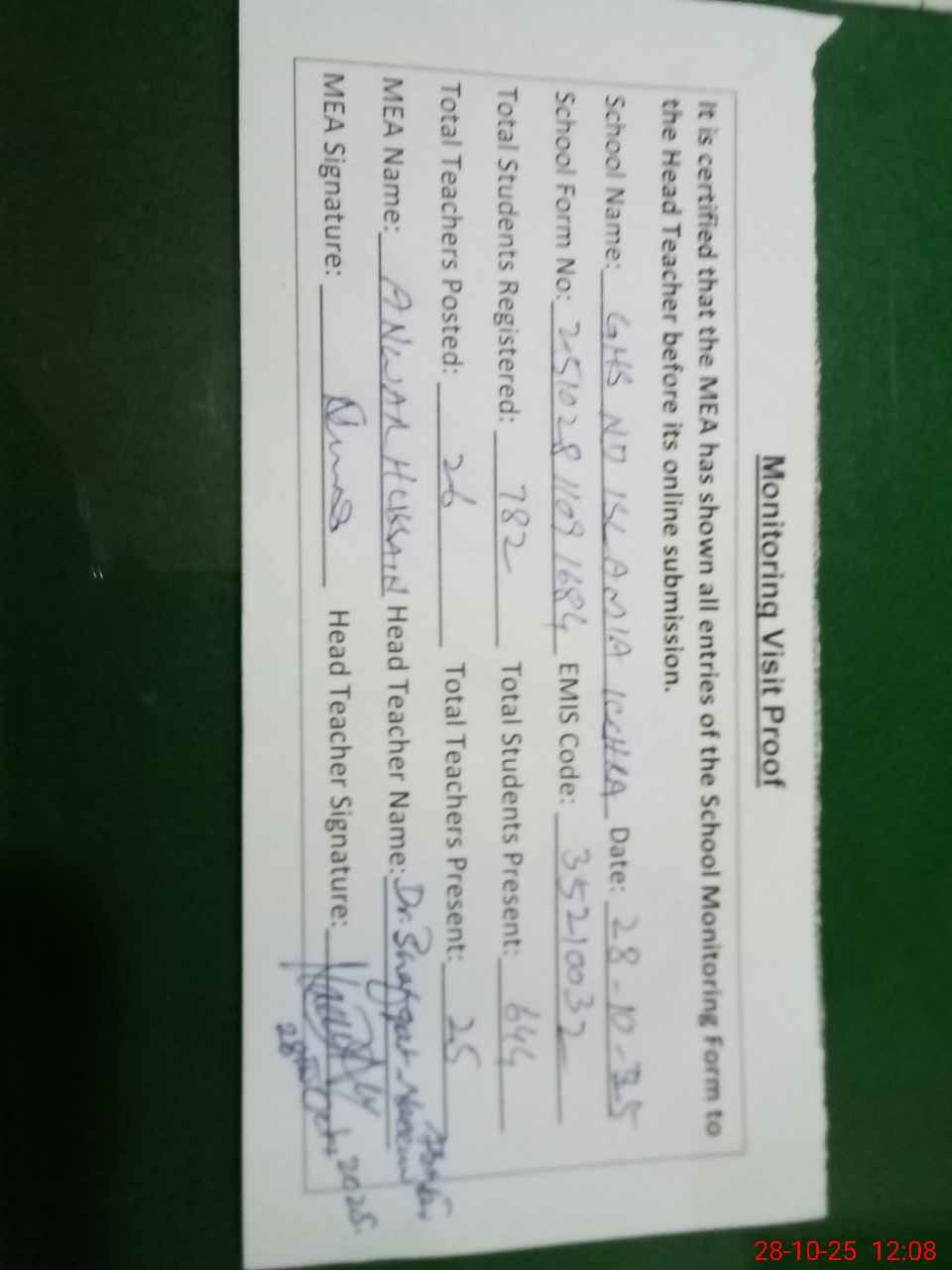 | Certified that this School was Inspected by the Undersigned MEA/DMO Today and the Information Stated Above is as Per Record. | |||||