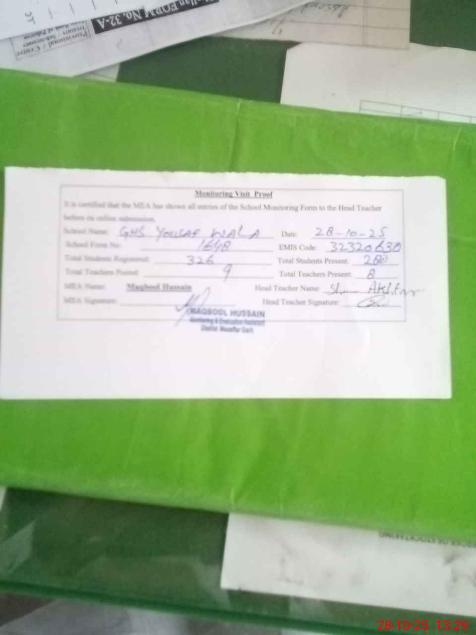 | Attendance Register | Head Teacher | MEA with School | Visit Proof |