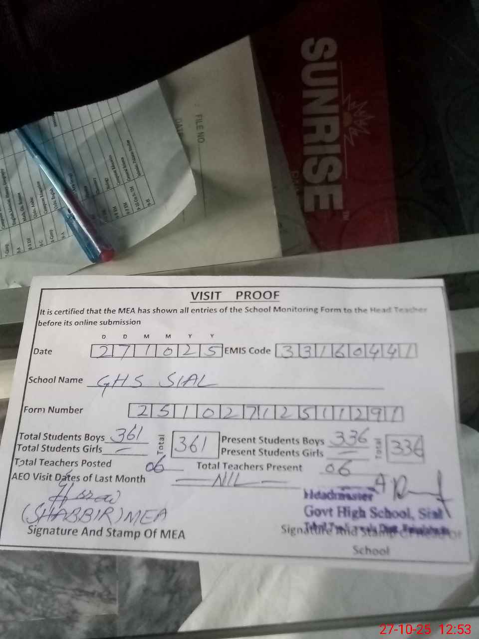 | Attendance Register | Head Teacher | MEA with School | Visit Proof |