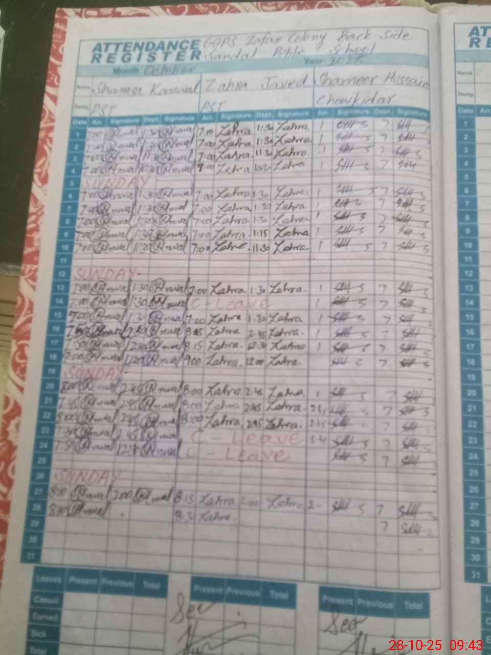 | CNIC | Full Name | Designation | R/C | Absence During Last Calender Month |