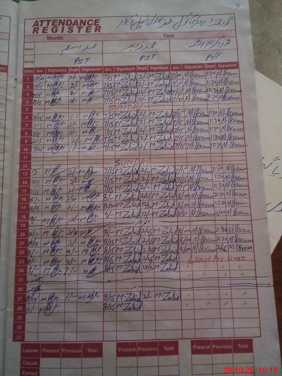 | CNIC | Full Name | Designation | R/C | Absence During Last Calender Month |