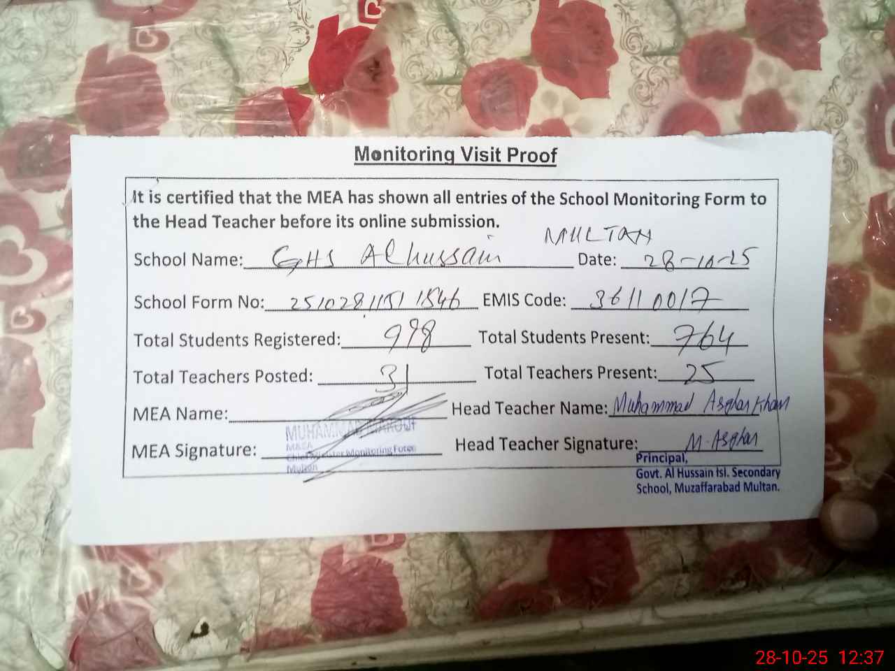 | EMIS Code: 36110017 | Name of School: GHS AL-HUSSAIN ISLAMIA MUZAFFAR ABAD MULTAN | |||