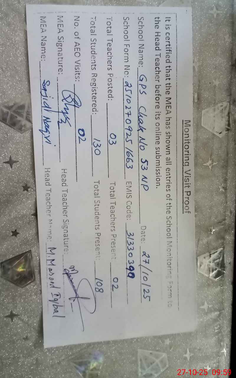 | EMIS Code: 31330390 | Name of School: GPS CHAK NO. 53 NP | |||