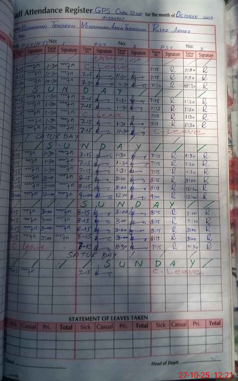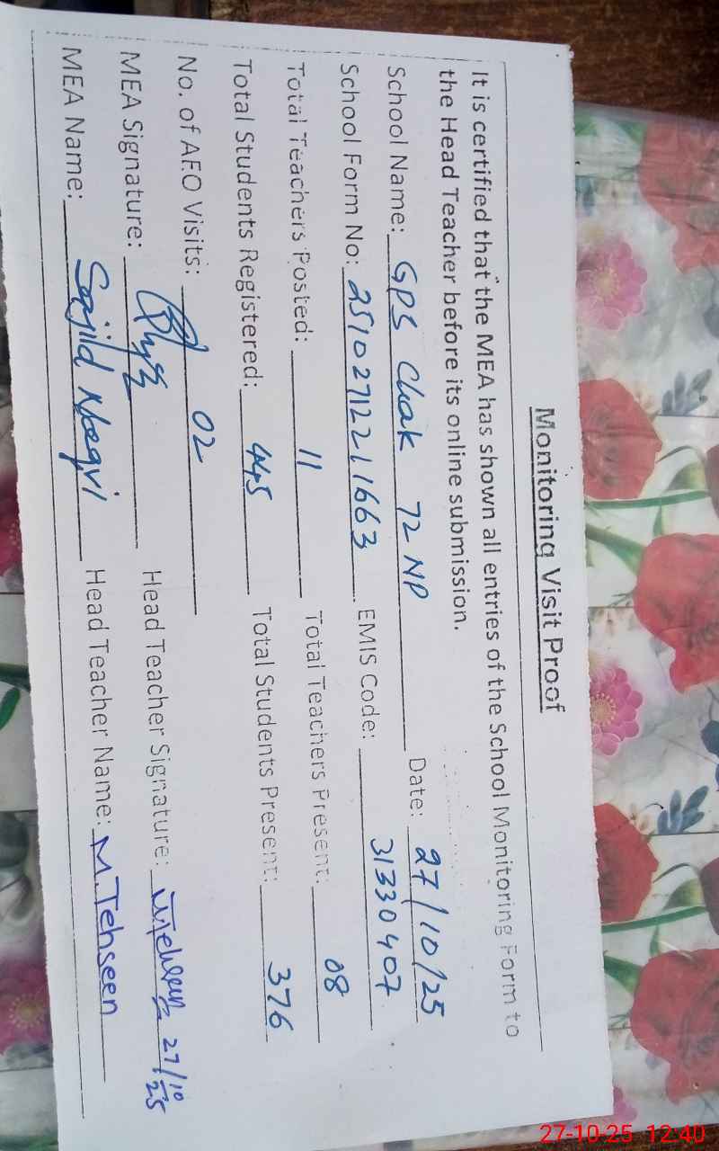 | EMIS Code: 31330407 | Name of School: GPS CHAK 72/NP BASTI KUMHARAN | |||