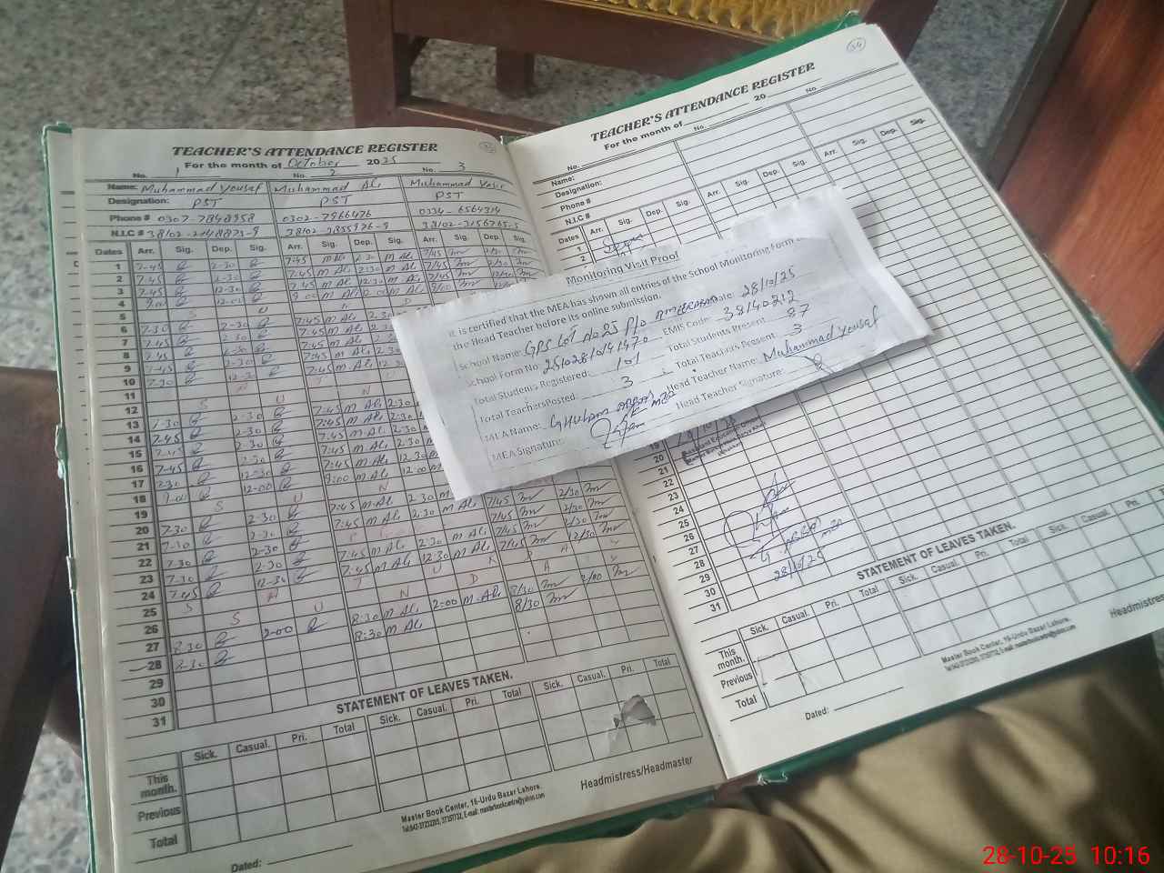 | Attendance Register | Head Teacher | MEA with School | Visit Proof |