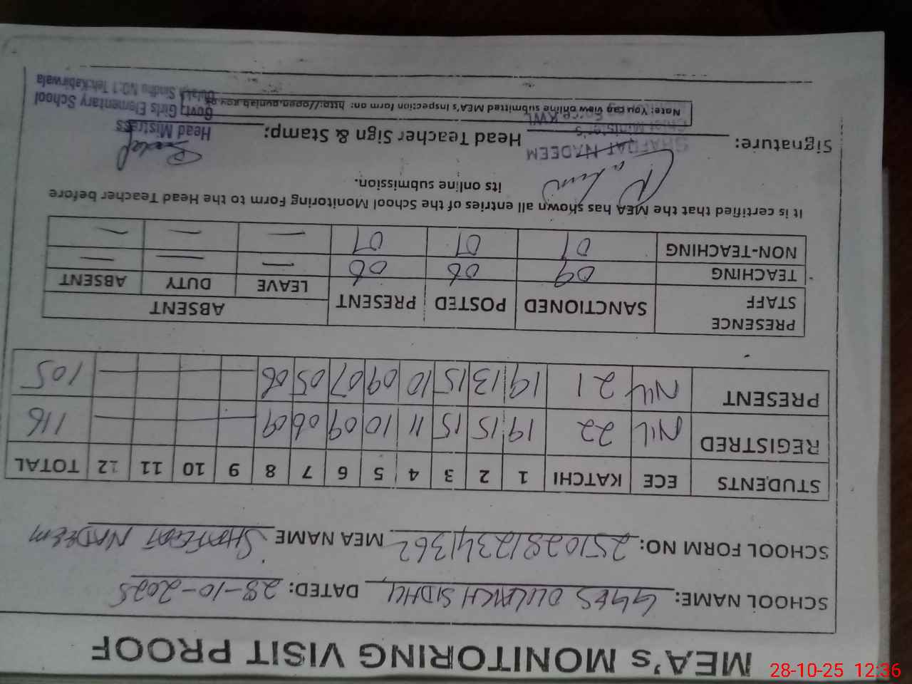 | Attendance Register | Head Teacher | MEA with School | Visit Proof |