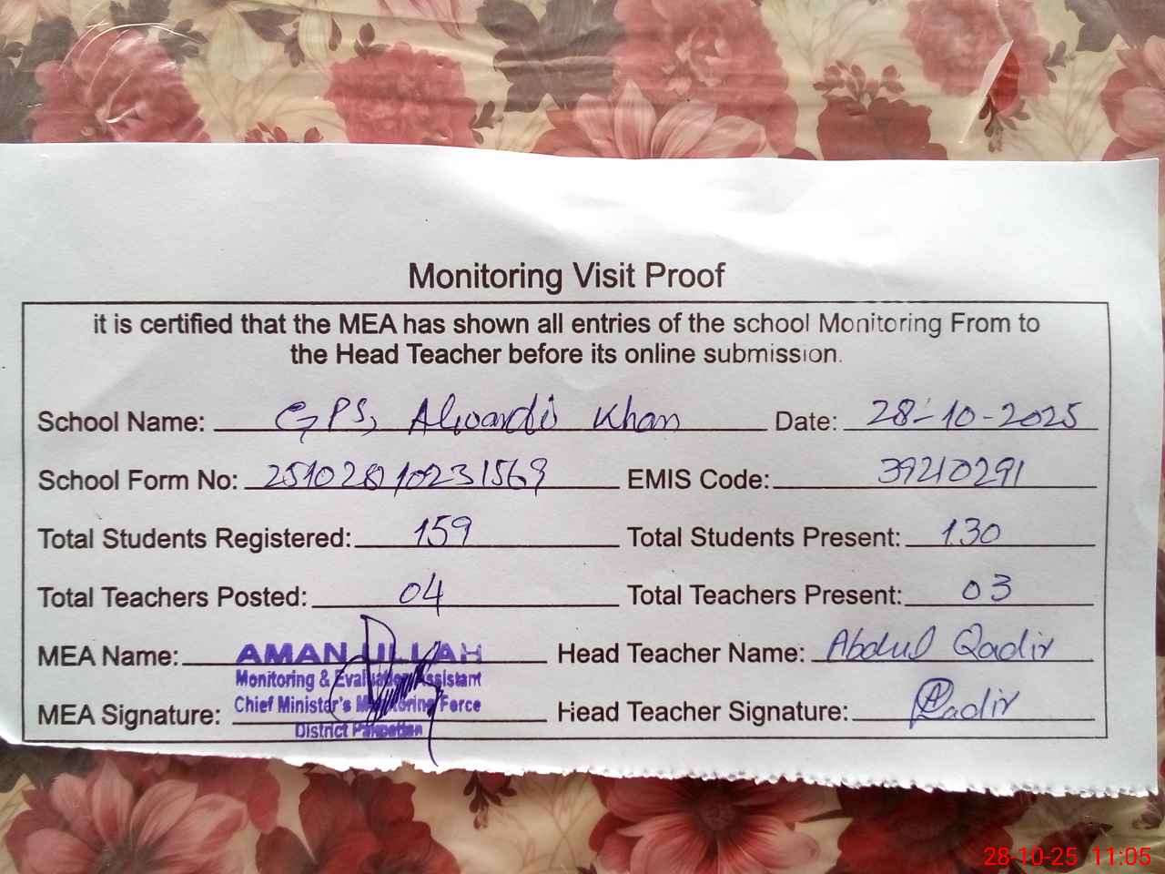 | EMIS Code: 39210291 | Name of School: GPS ALWARDI KHAN | |||
