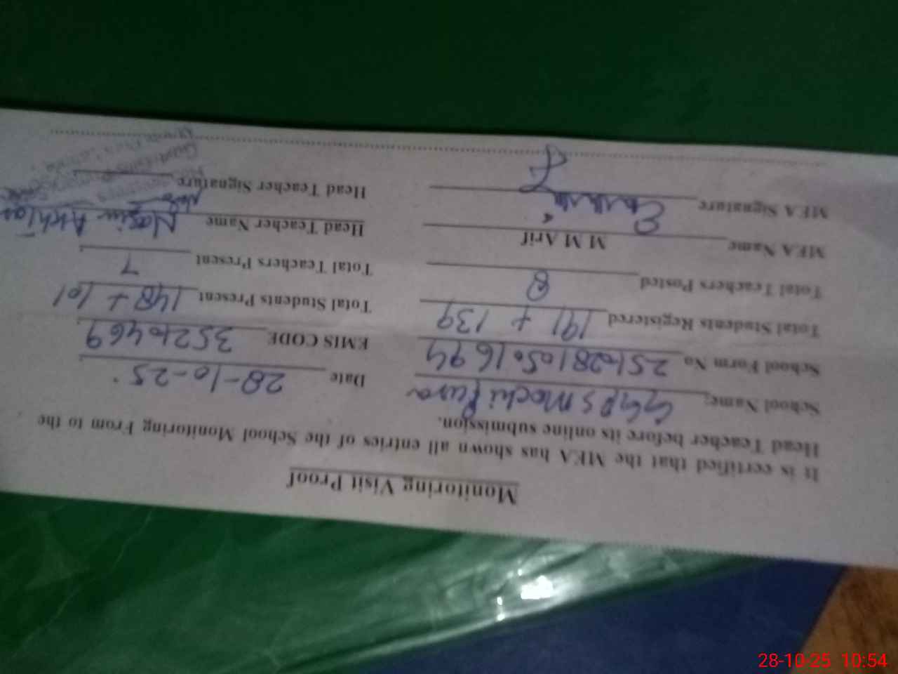 | Monitoring Date: 28-10-2025 | Start Time: 28-10-2025 10:30 AM | End Time: 28-10-2025 10:54 AM | Name of MEA: MU**** AR**** (N**** | |