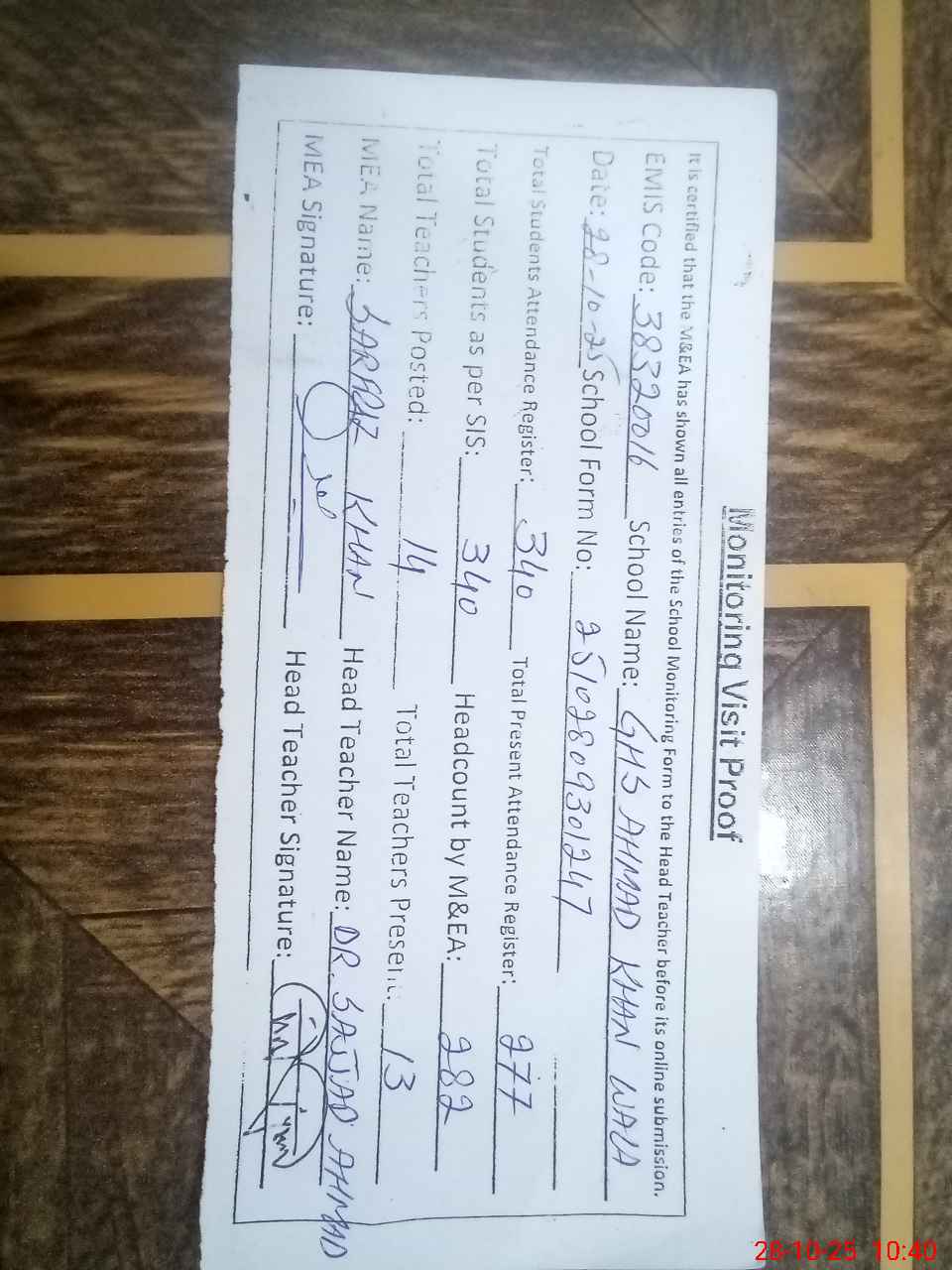 | Attendance Register | Head Teacher | MEA with School | Visit Proof |