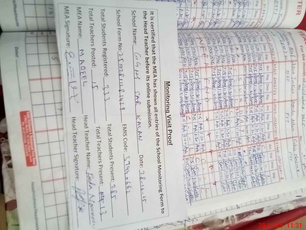| Attendance Register | Head Teacher | MEA with School | Visit Proof |