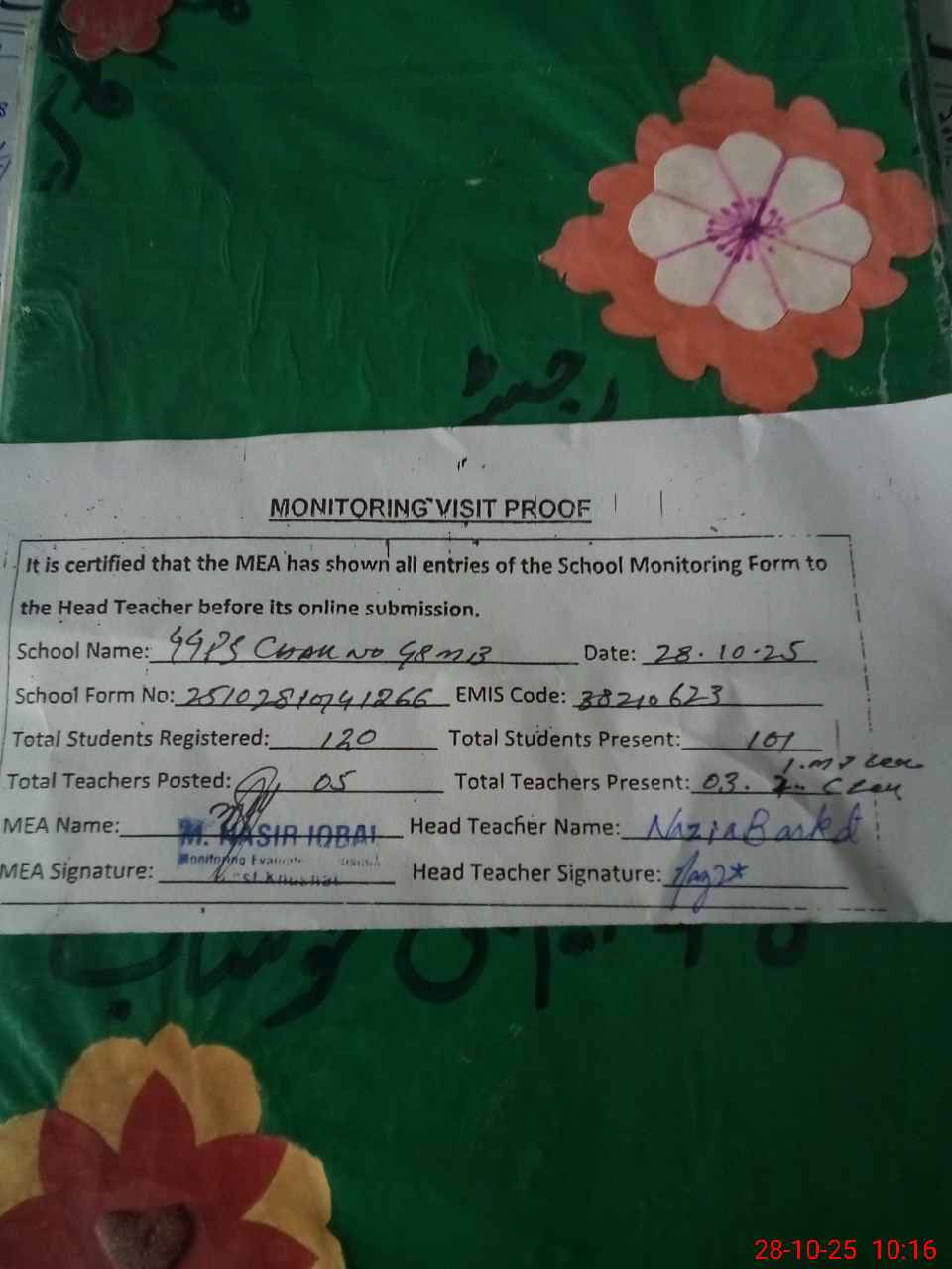 | Attendance Register | Head Teacher | MEA with School | Visit Proof |