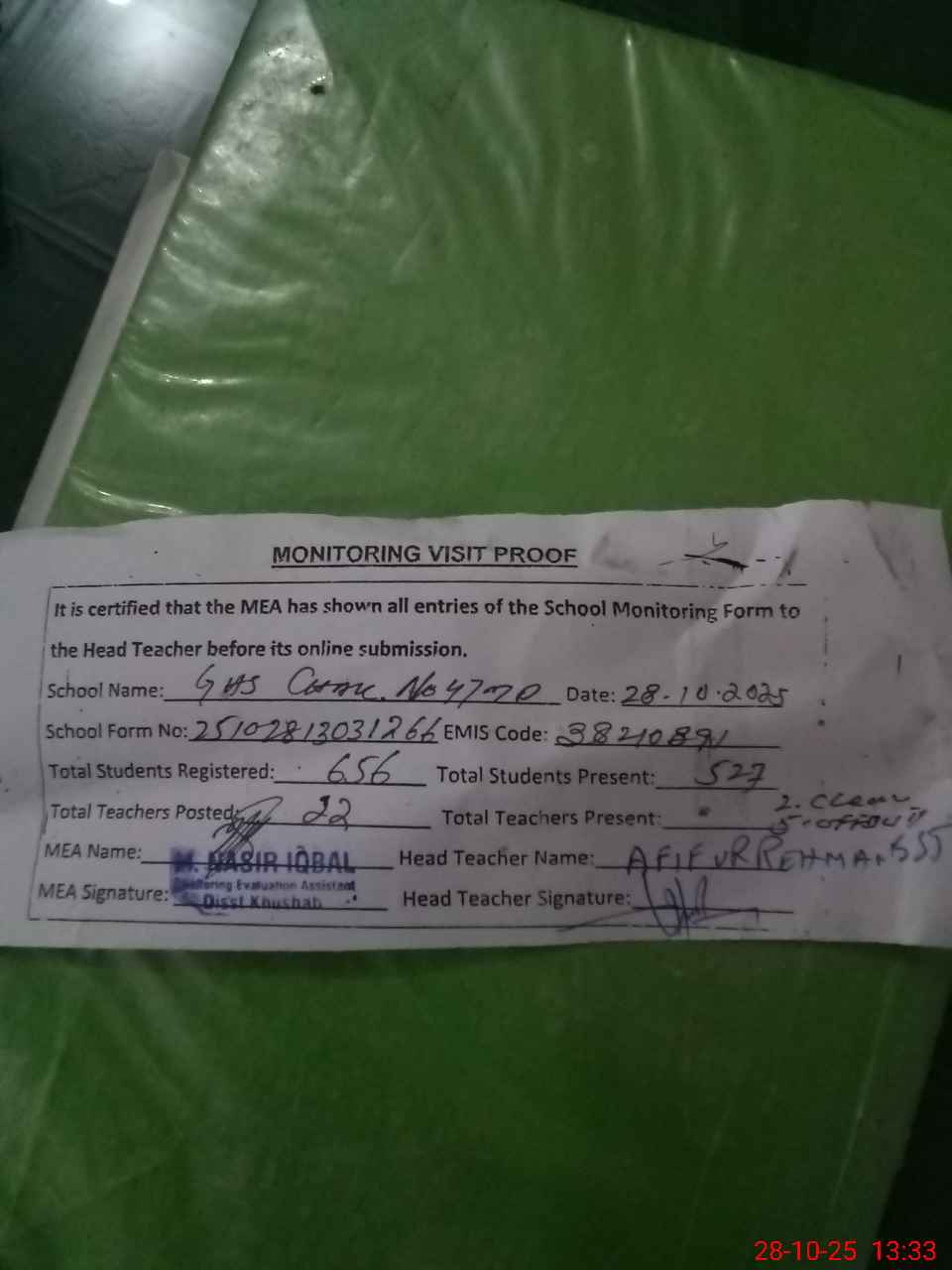 | Attendance Register | Head Teacher | MEA with School | Visit Proof |