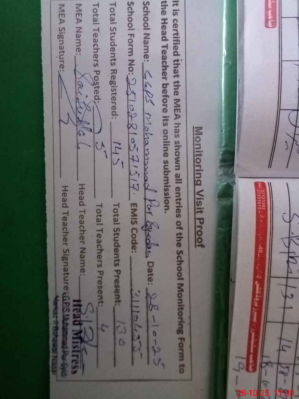 | Attendance Register | Head Teacher | MEA with School | Visit Proof |